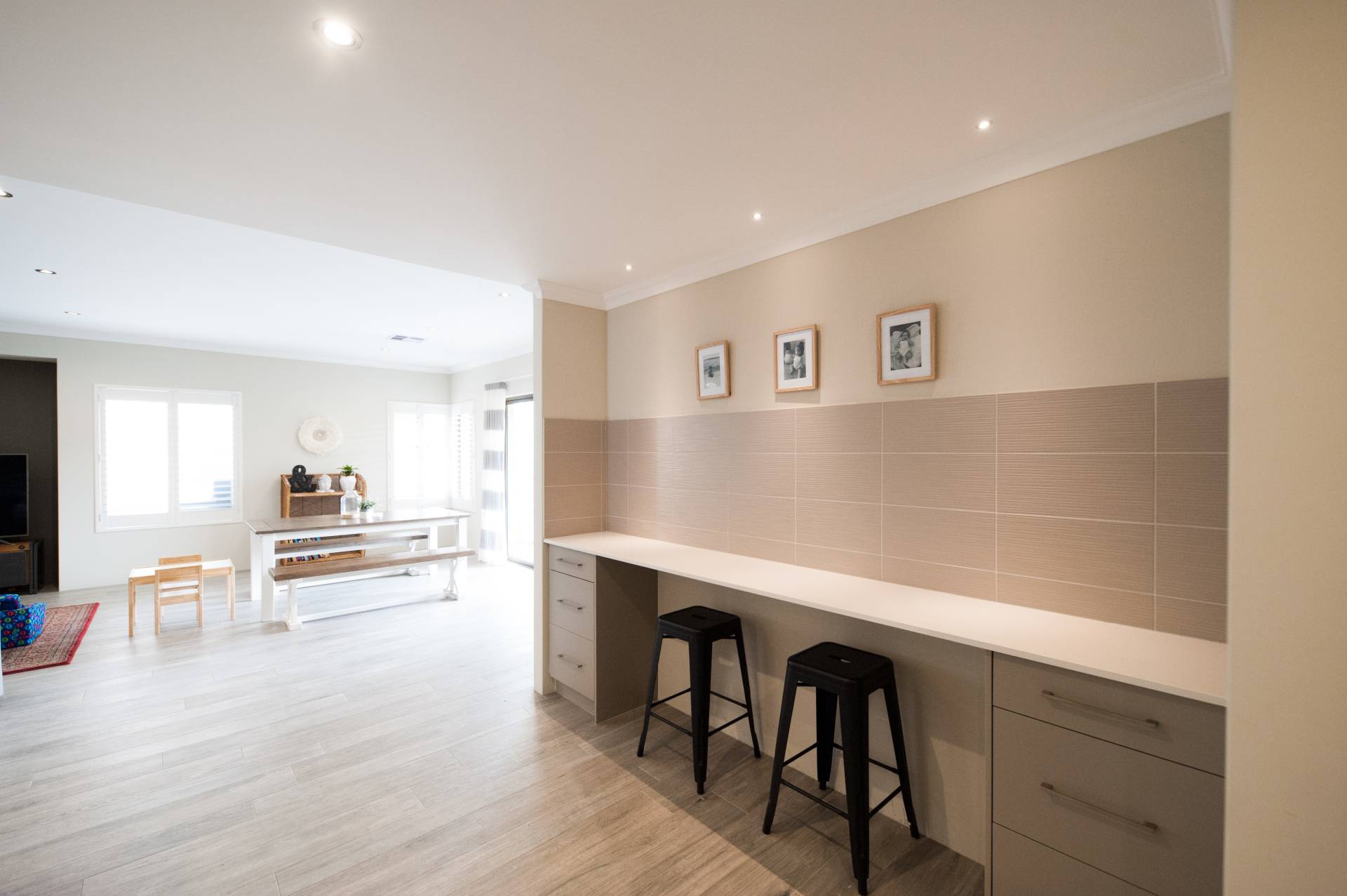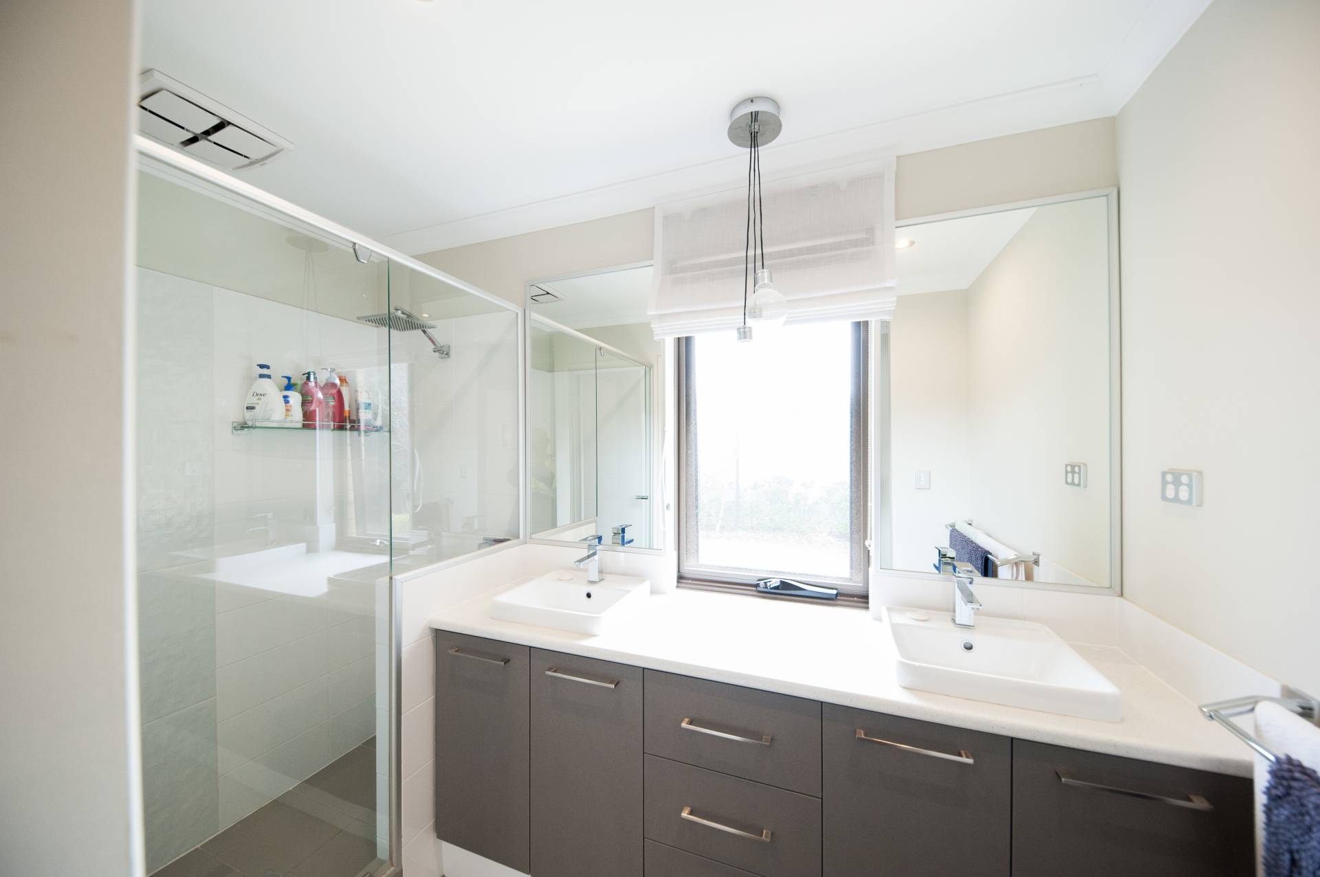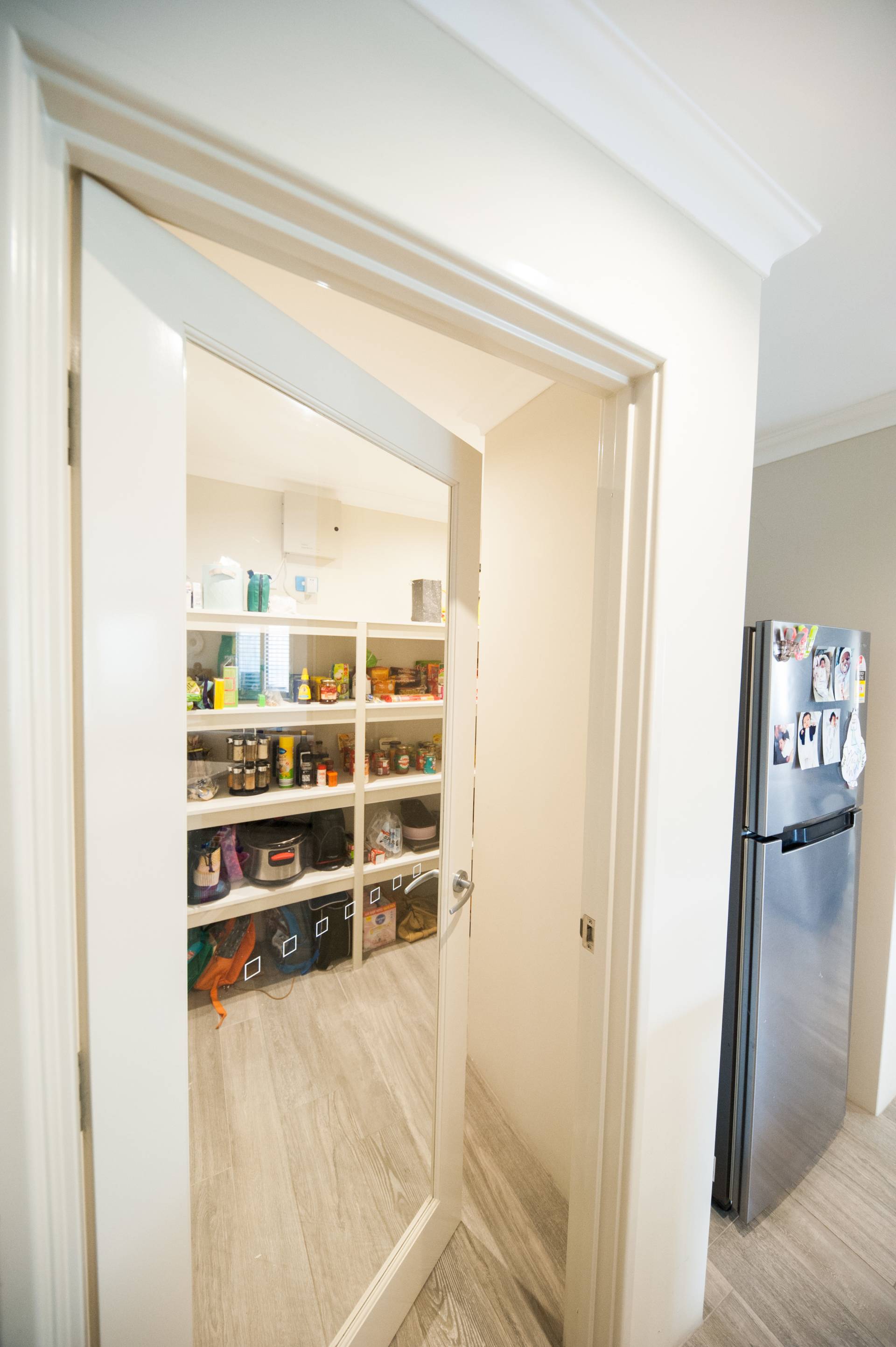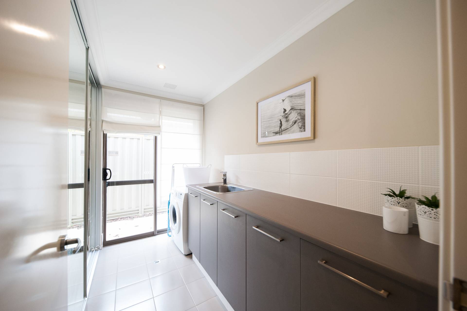 * Neat laundry with built in cupboards, long bench and large mirrored sliding door storage