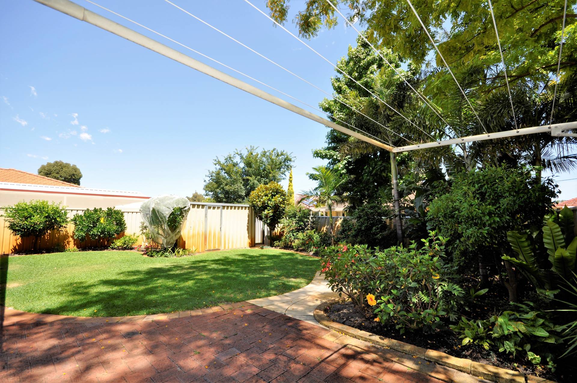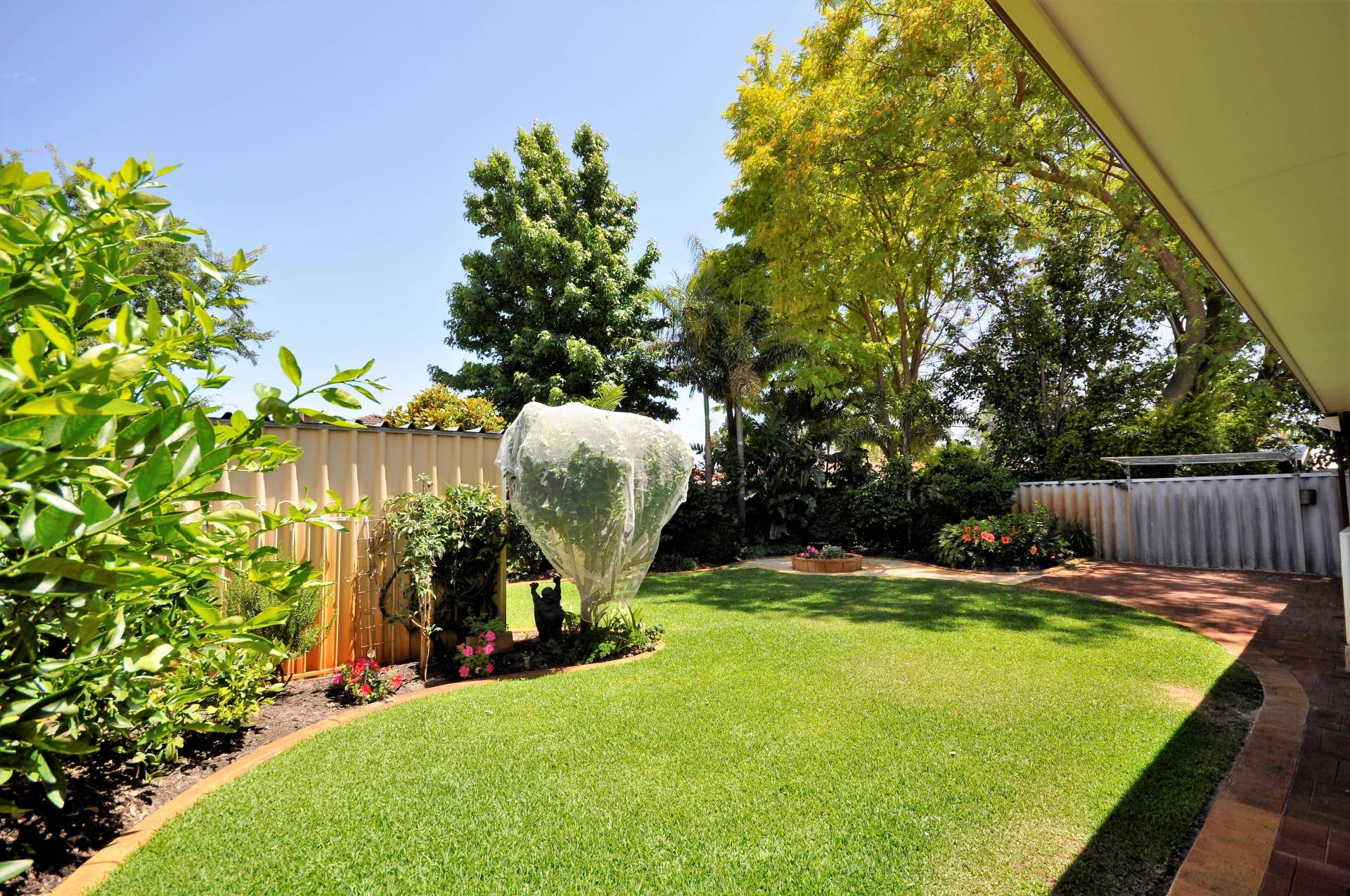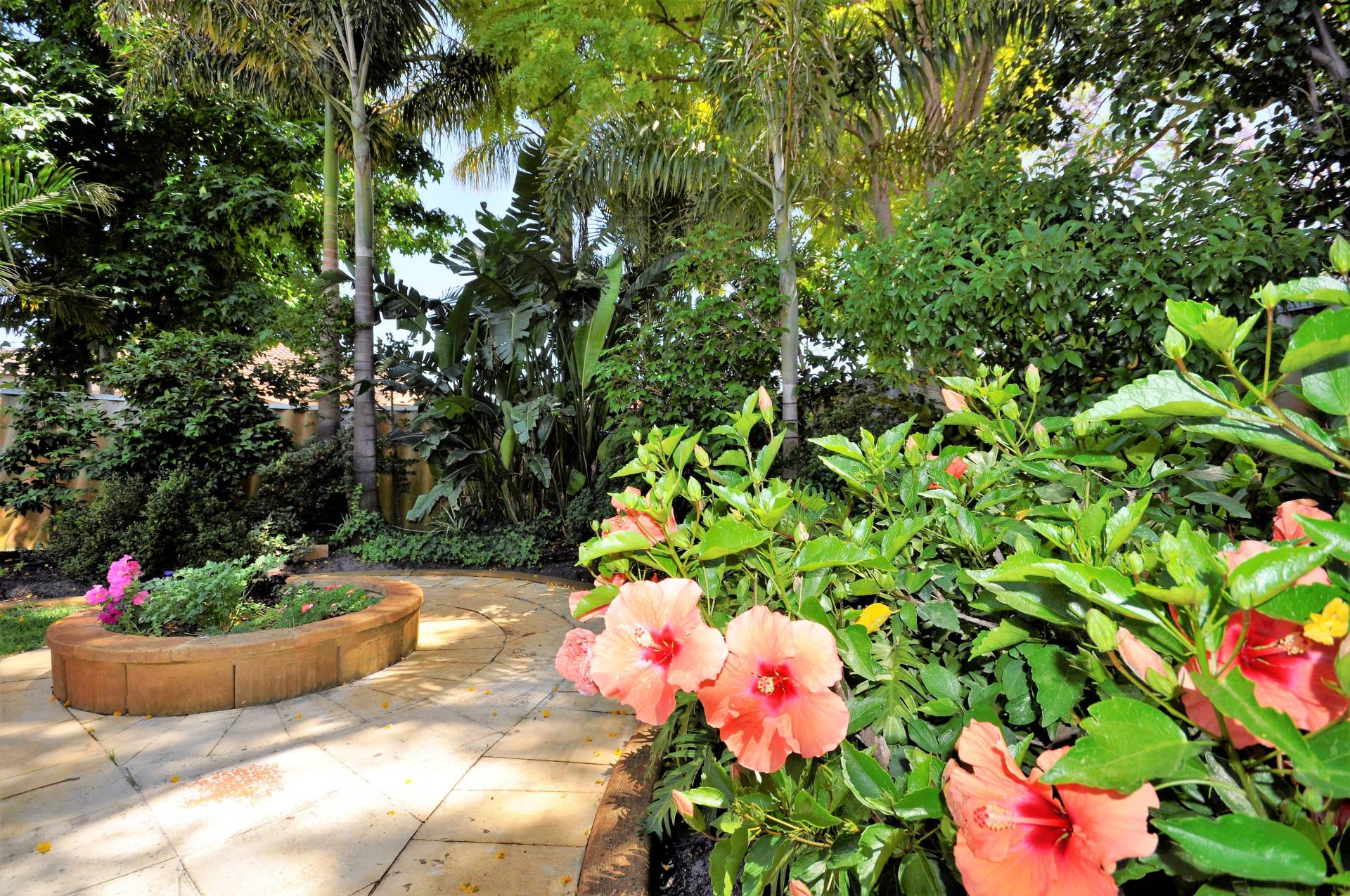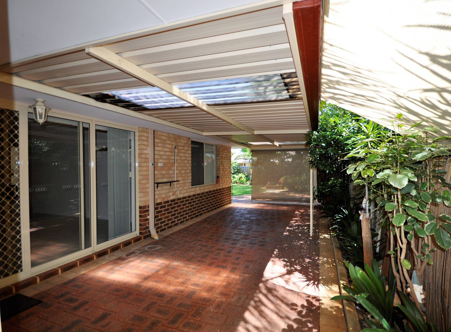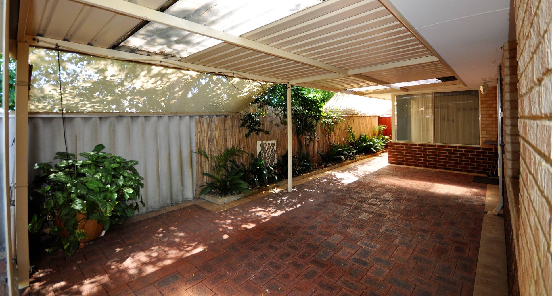*  Patio to the side of the house with gorgeous garden beds and patio blind