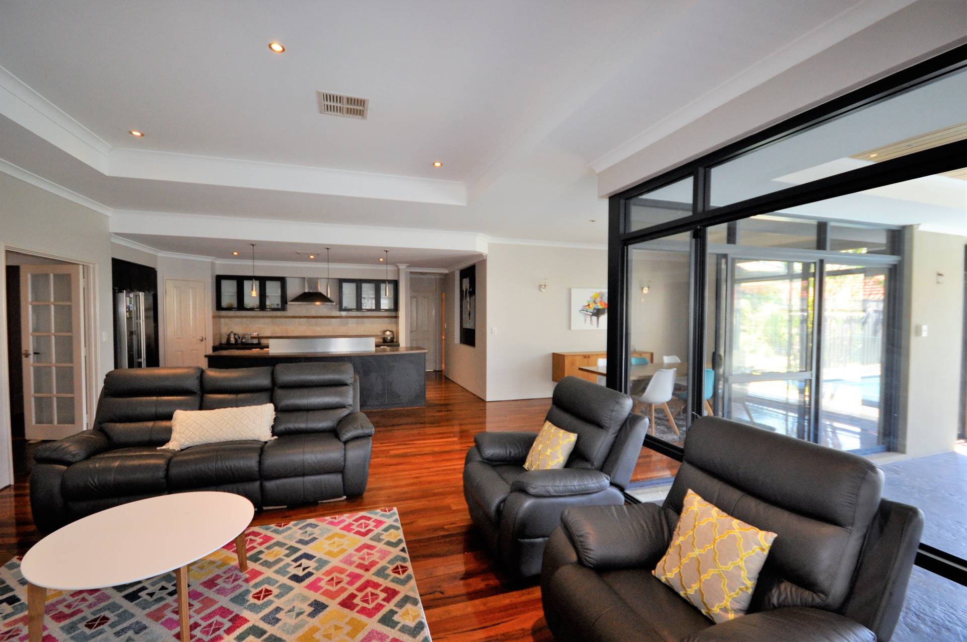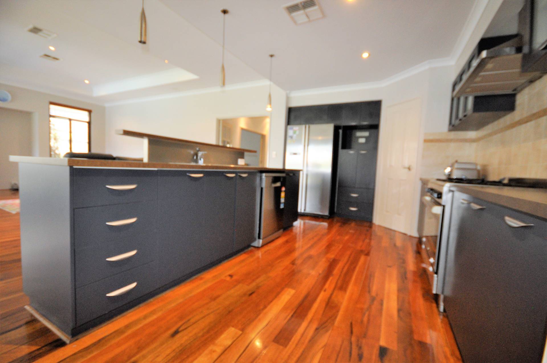 *  Large open plan kitchen, living and dining room, with stunning Marri flooring