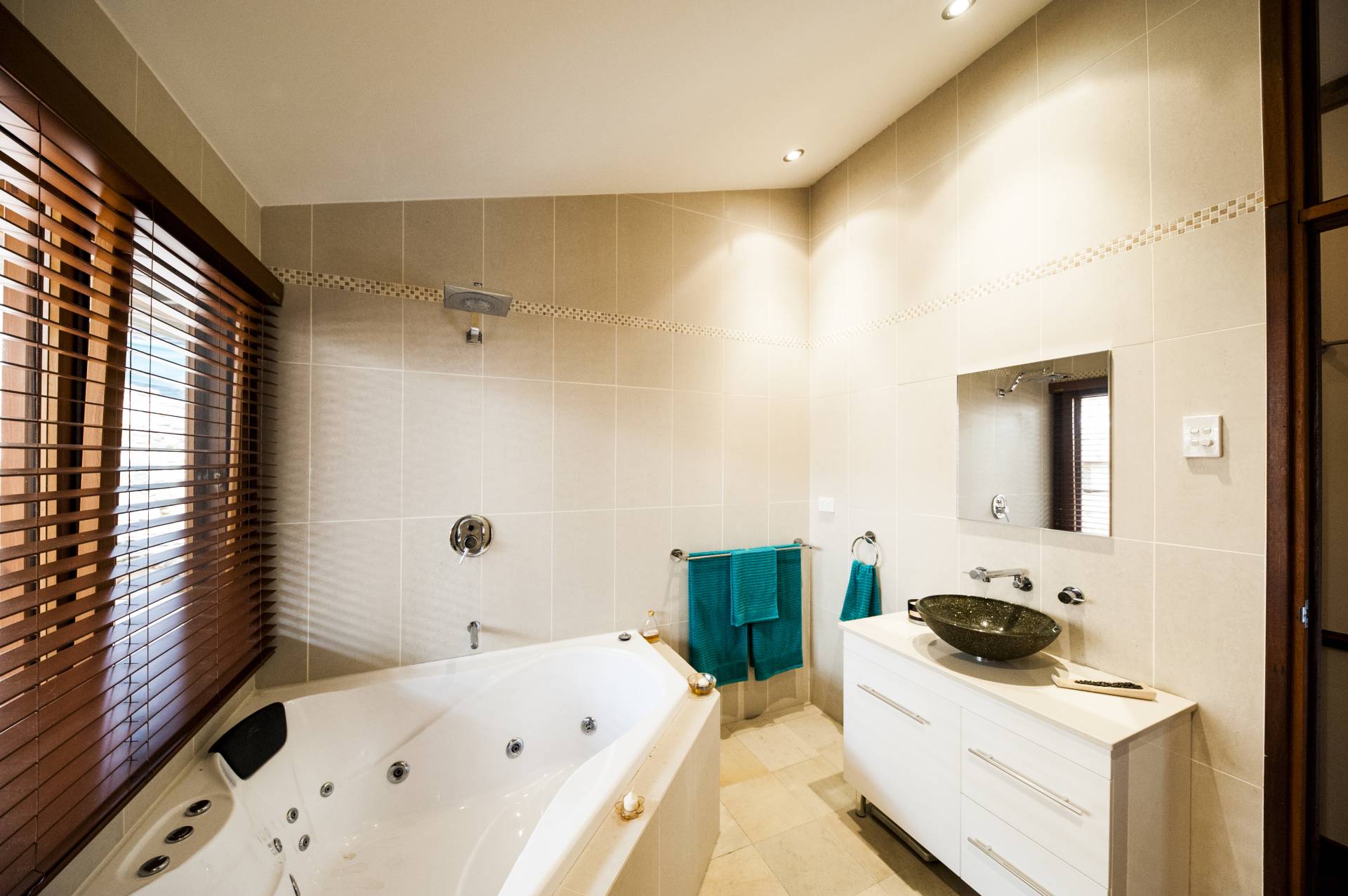 -          Main bathroom with relaxing corner spa bath, shower over bath, and toilet
