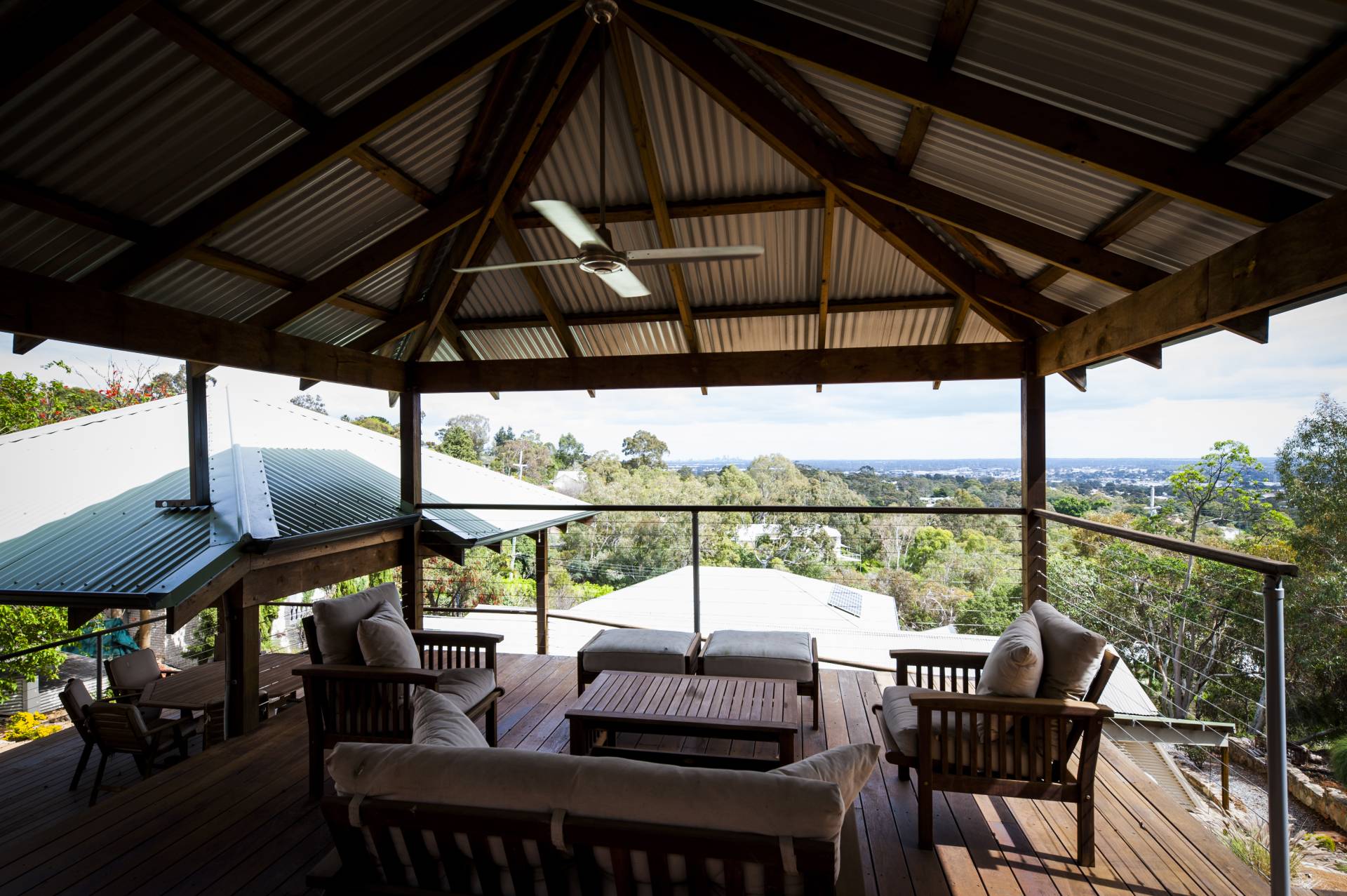 -          2 large covered entertaining decks with storage raised above the house to take advantage of the views