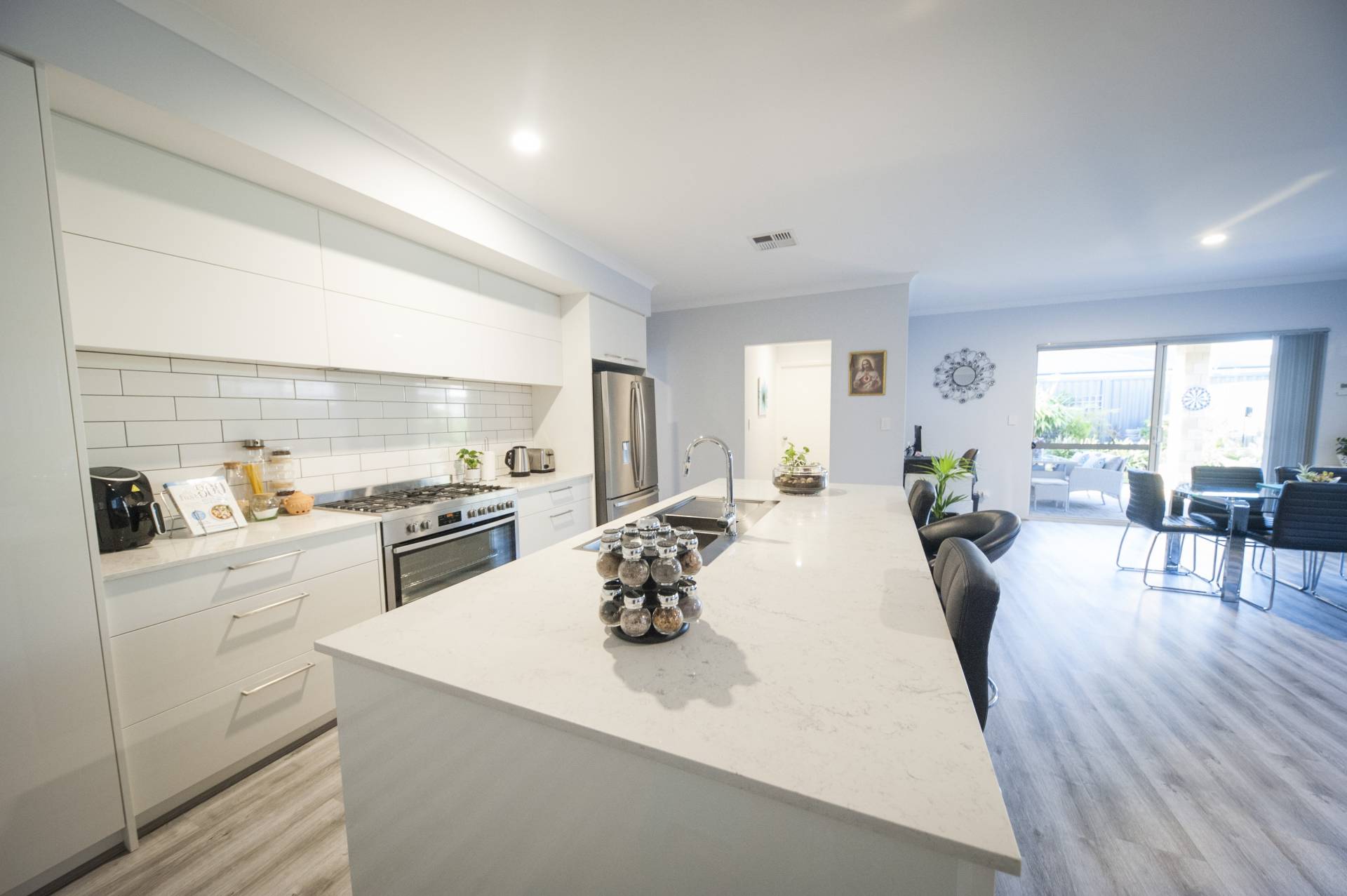 -          Chefs kitchen with plenty of cupboards and bench space, including a massive island bench that doubles as a breakfast bar