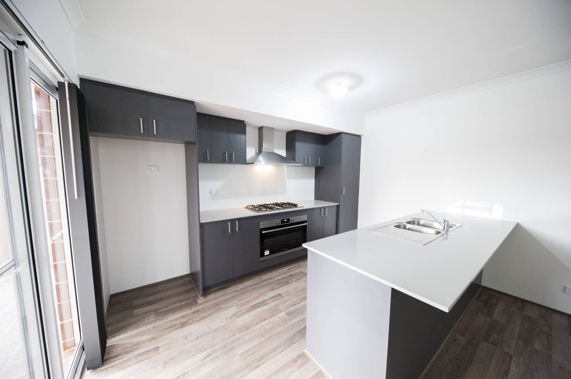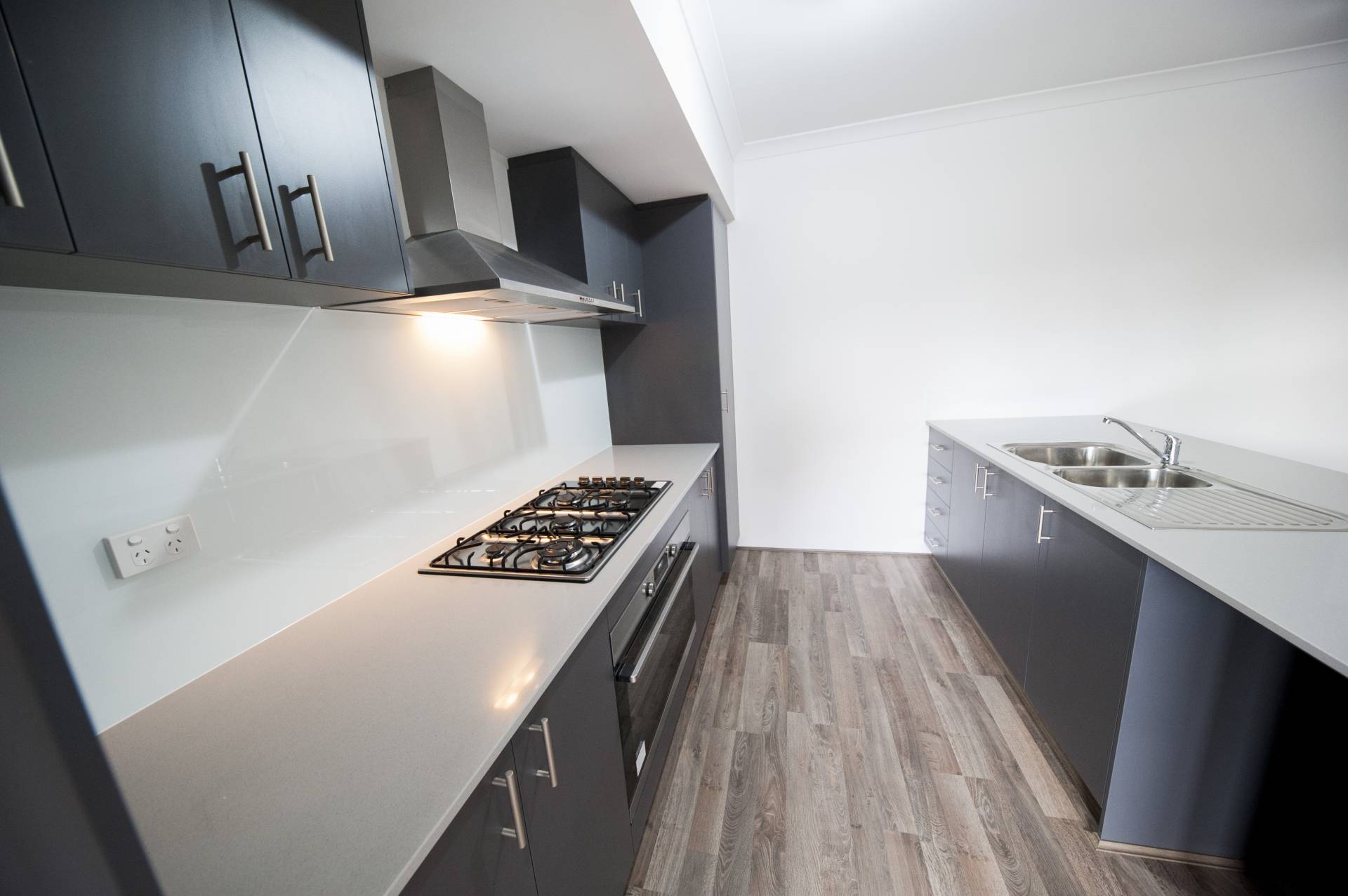 - Galley style Kitchen with stone bench tops, 900mm stainless steel gas hotplate & oven.