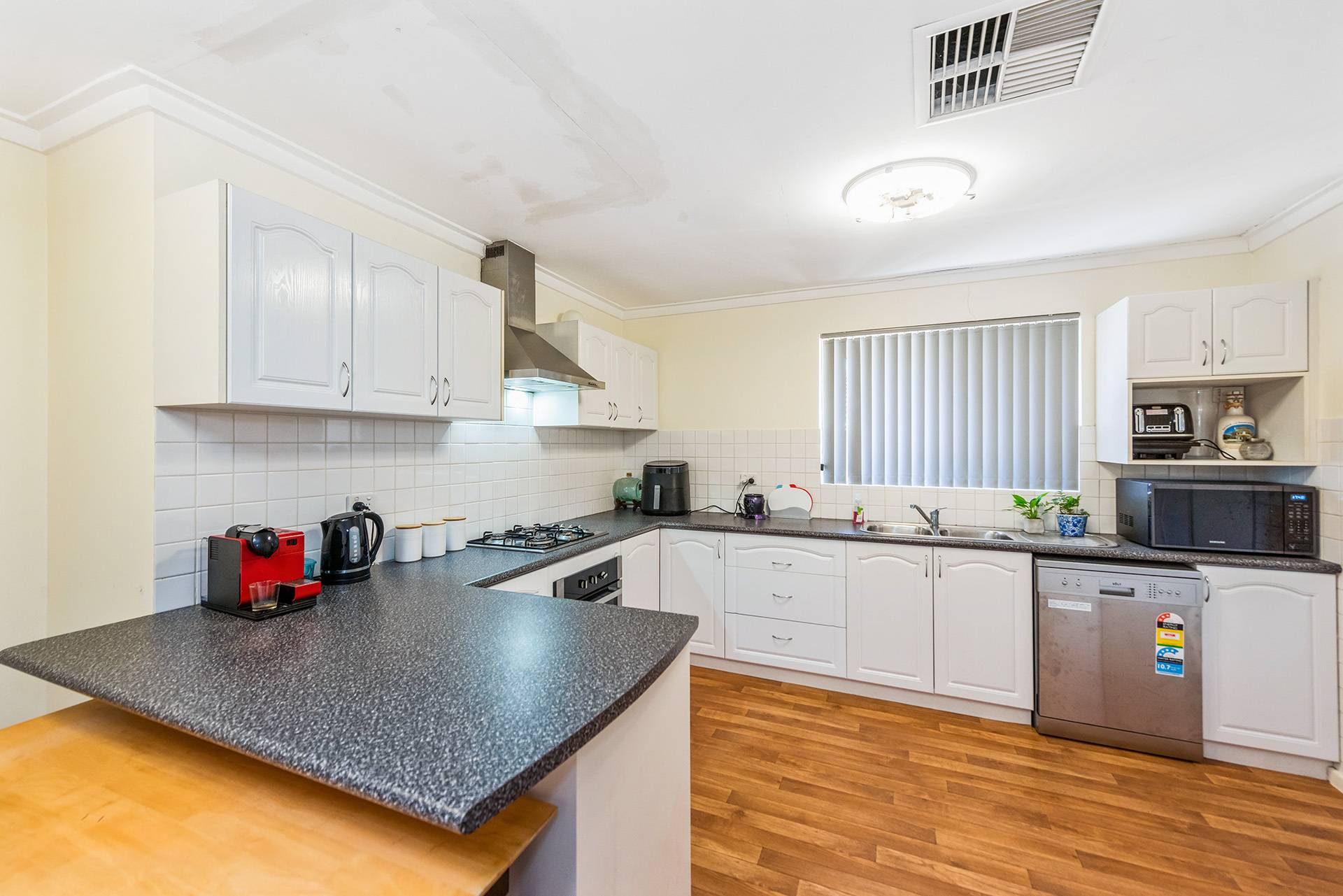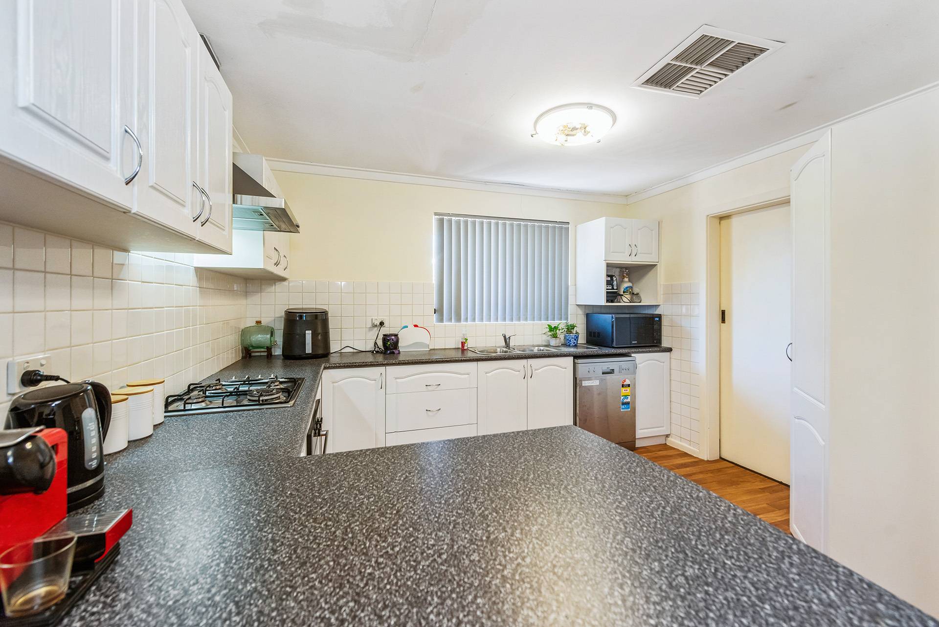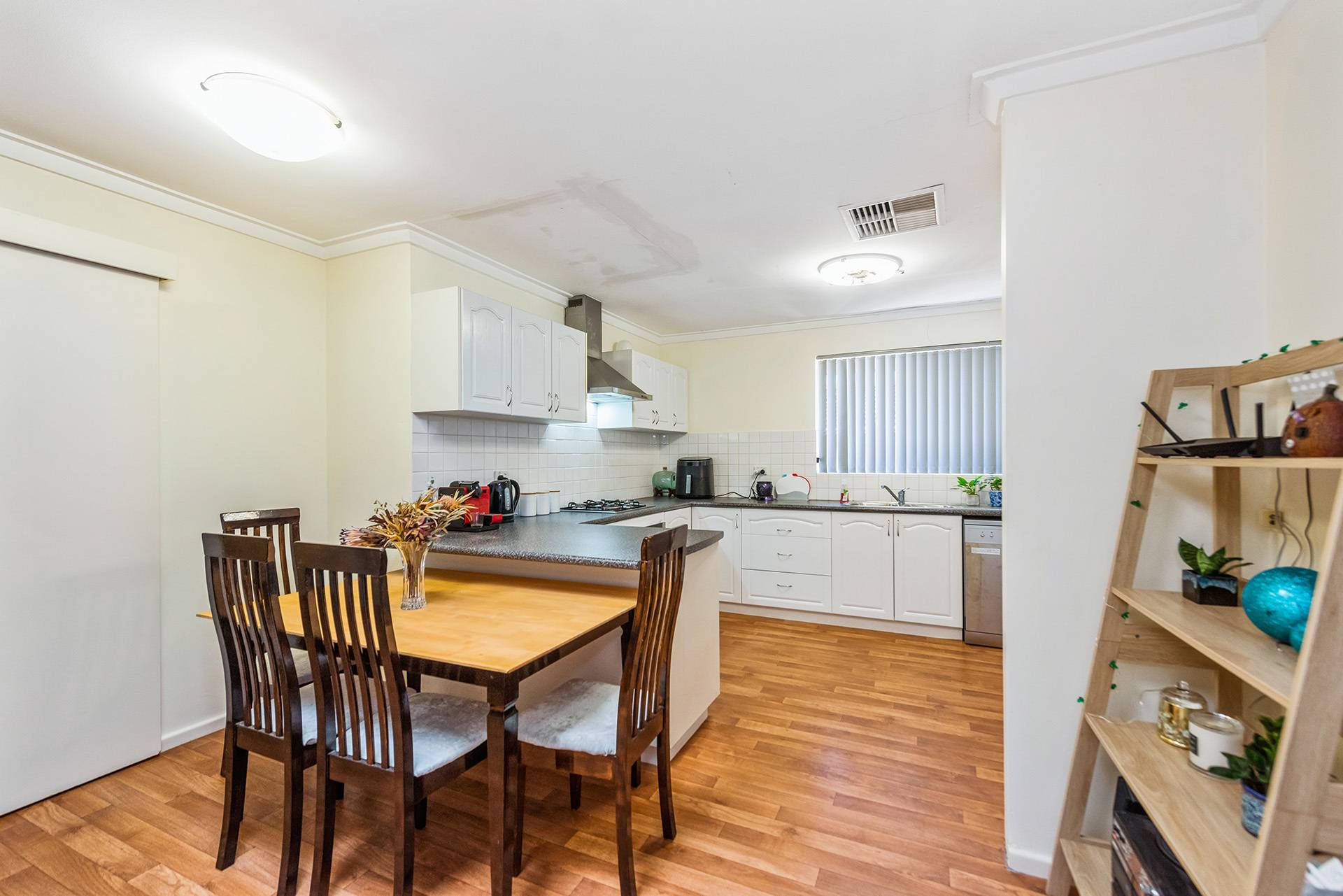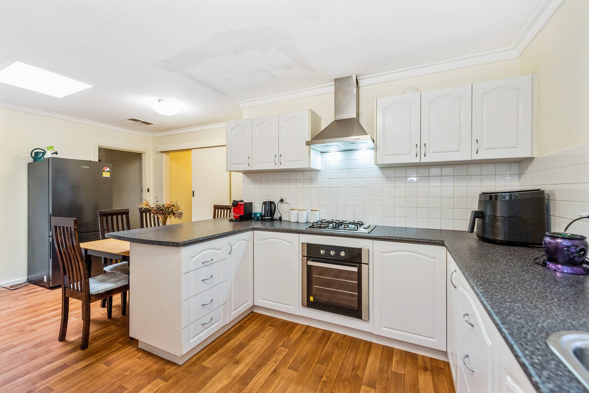 Modern kitchen with plenty of cupboard space and gas hotplates.
