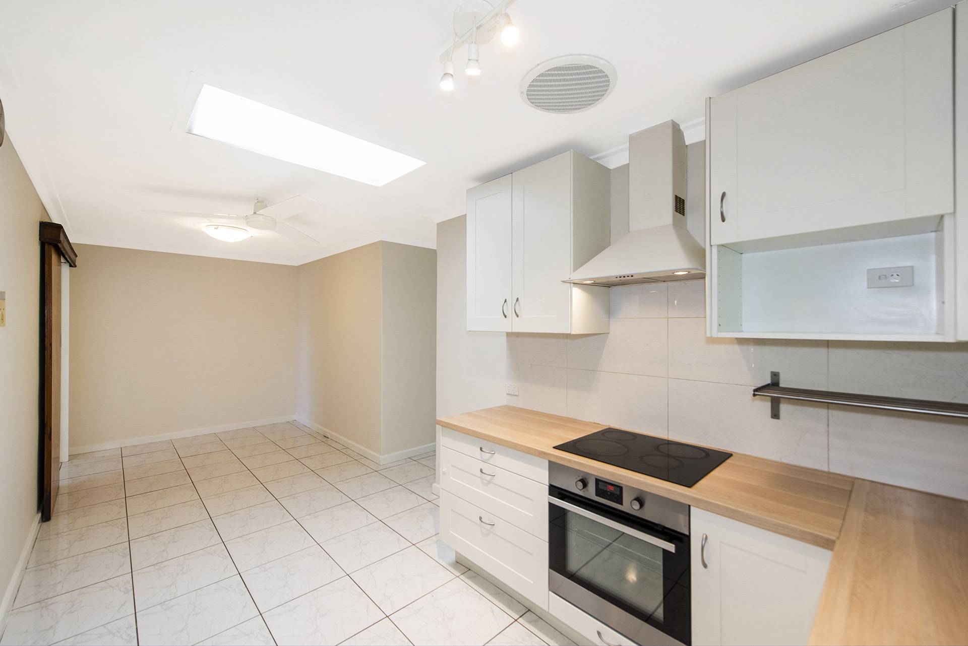 Modern kitchen with electric hotplates and plenty of cupboard space.