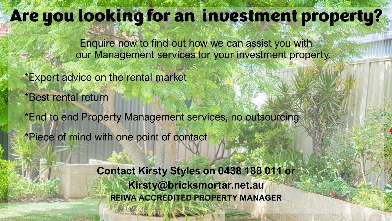 Kirsty Styles is also a Licensed REIWA Accredited Property Manager and also manages this property for the current owners.  Bricks & Mortar Real Estate provides end to end Property Management services with no outsourcing, all services inhouse and with one point of contact.