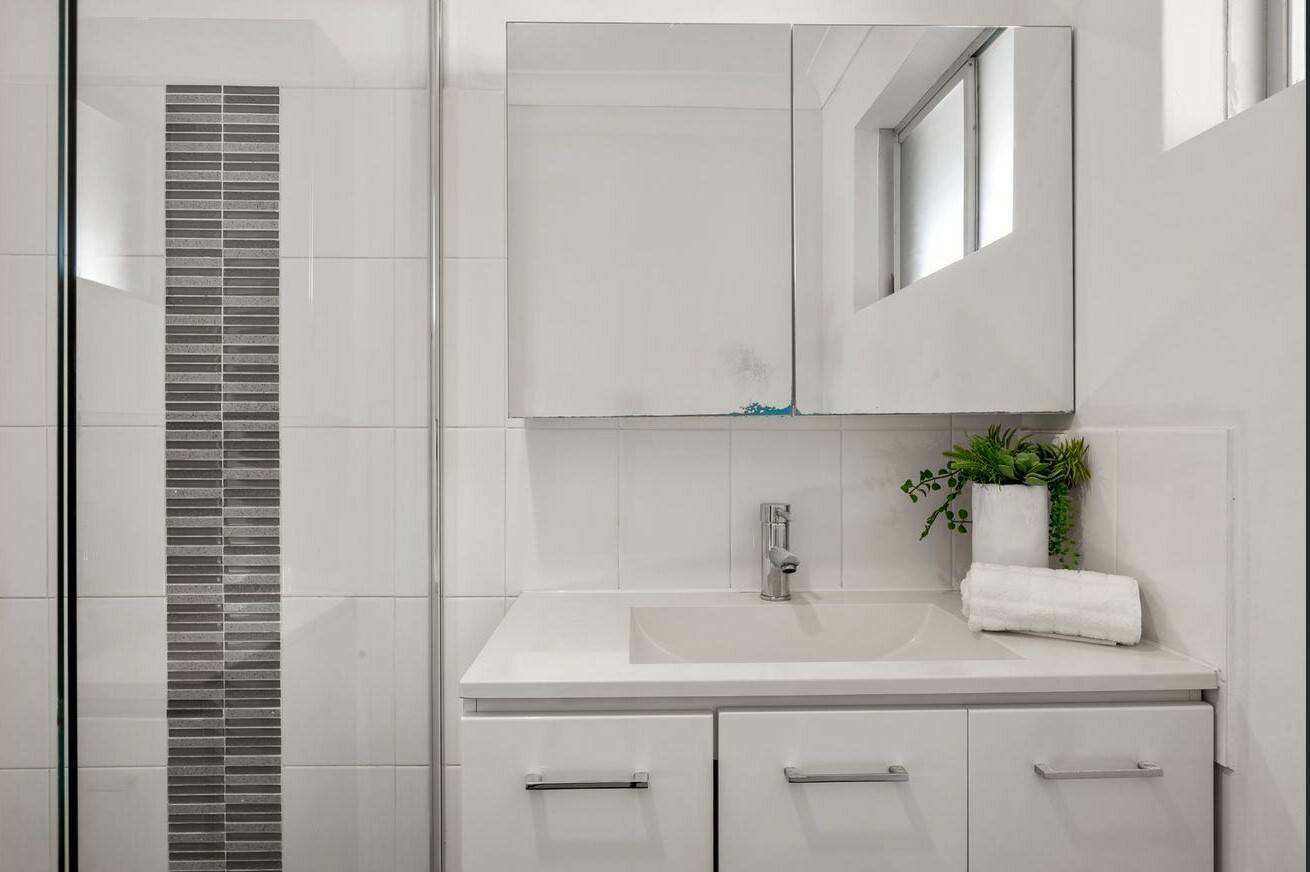 The contemporary bathroom is sleek and stylish, featuring a modern vanity, spacious shower and contemporary fixtures, the neutral tones create a calming atmosphere, perfect for everyday use.