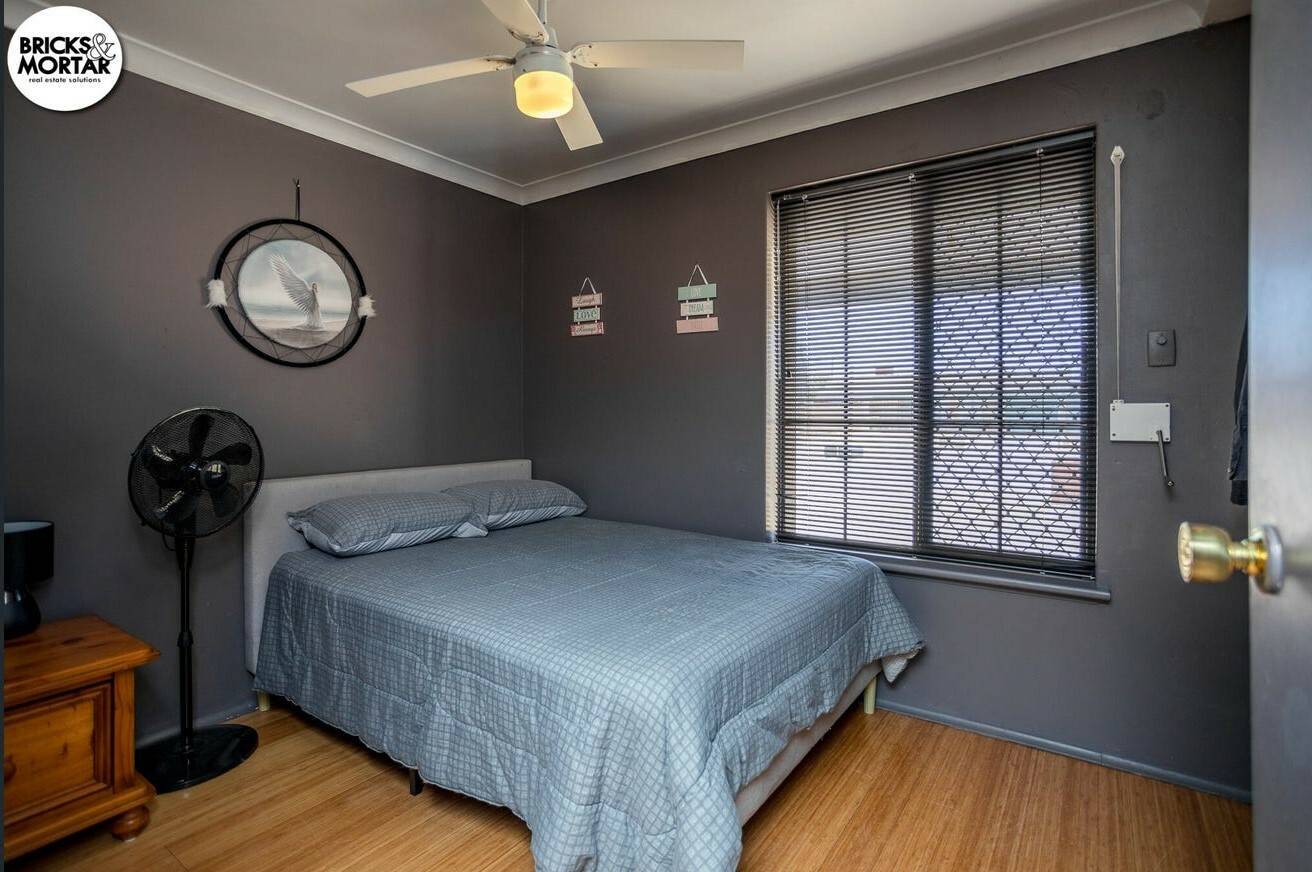 The main bedroom offers good space with mirrored sliding robes and a ceiling fan. A split system air conditioner adds to the comfort: this upgrade is not reflected in current advertising photos.